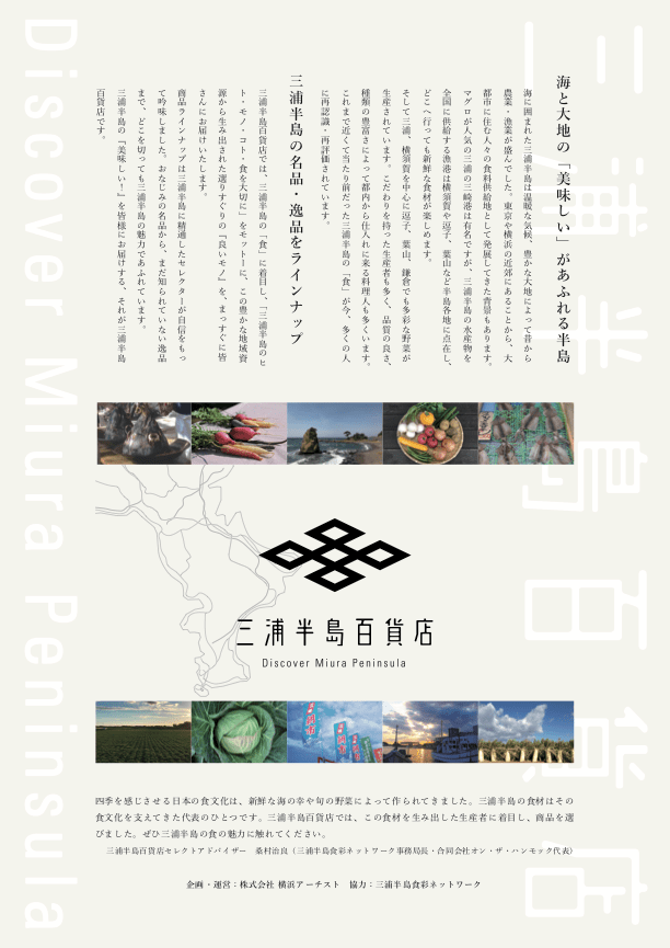 三浦半島百貨店は、三浦半島の「食」に着目し、「三浦半島のヒト・モノ・コト・食を大切に」をモットーに、この豊かな地域資源から生み出された選りすぐりの『良いモノ』を届ける三浦半島に特化した物産企画です。