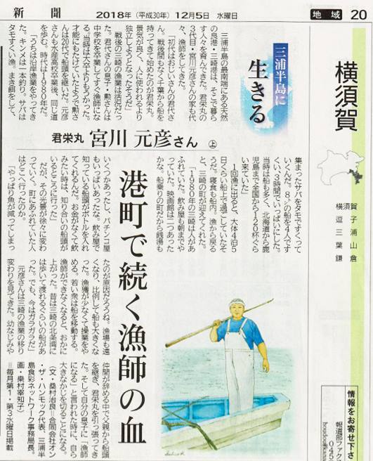 12/5発行の神奈川新聞の連載「三浦半島に生きる」第5回が掲載されました。今回は三崎港 湘南しらす 君栄丸の船頭「宮川元彦さん 上編」です。