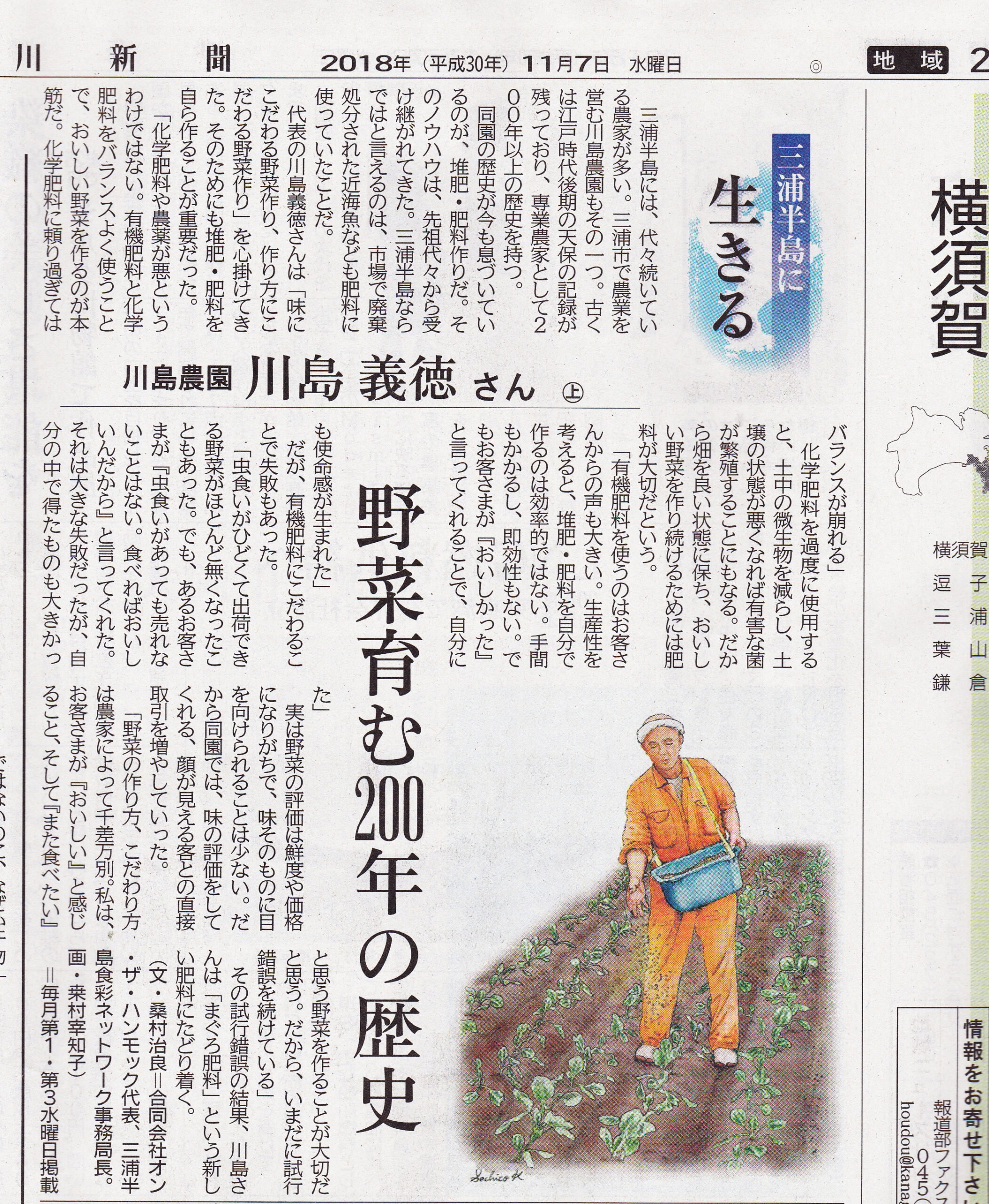 11/7発行の神奈川新聞 連載「三浦半島に生きる」の第3回が掲載されました。今回は「川島 義徳 さん 上編」です。三浦で200年の歴史がある川島農園で代々受け継がれてきた堆肥・肥料作りなどについてお話を聞かせていただきました。