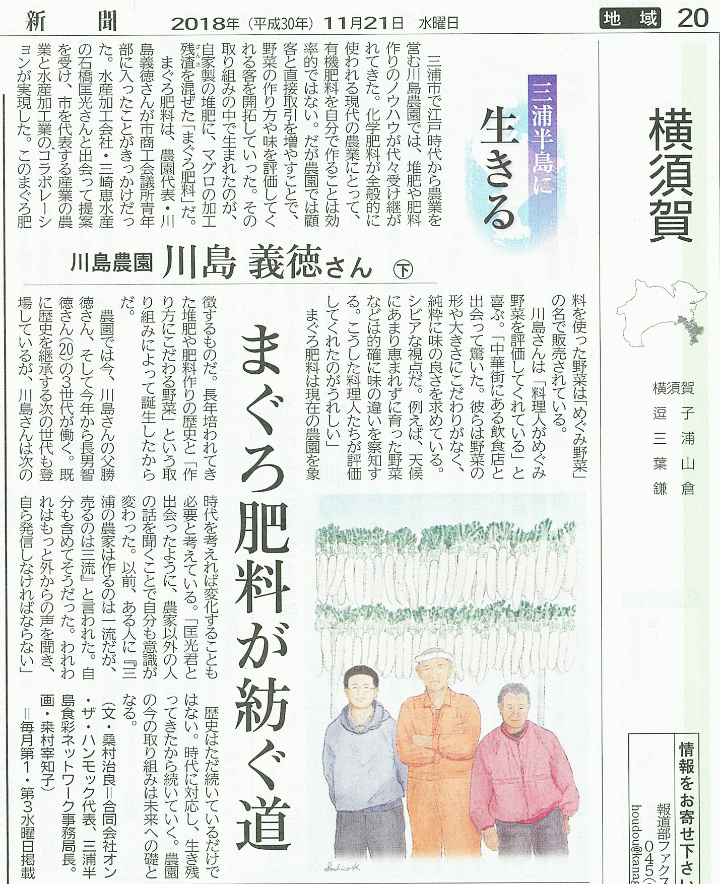本日11/21発行の神奈川新聞に連載「三浦半島に生きる」の第4回が掲載されました。今回は「川島 義徳さん 下編」です。三浦で200年の歴史がある川島農園で代々受け継がれてきた堆肥・肥料作りから生まれた「まぐろ肥料」について紹介しています。